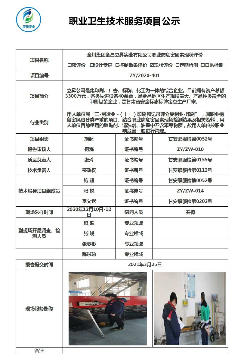 金川集团金昌立昇实业有限公司职业病危害现状评价