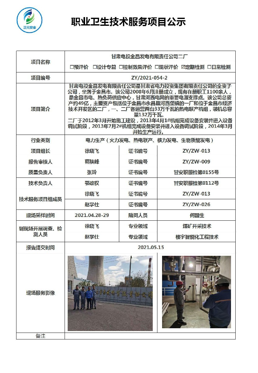 甘肃电投金昌发电有限责任公司二厂工作场所职业病危害因素定期检测