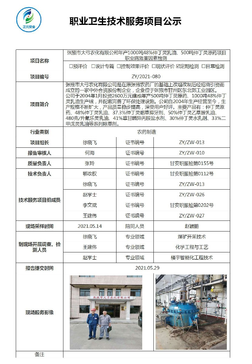 张掖市大弓农化有限公司年产1000吨48%仲丁灵乳油、500吨仲丁灵原药项目职业病危害因素检测