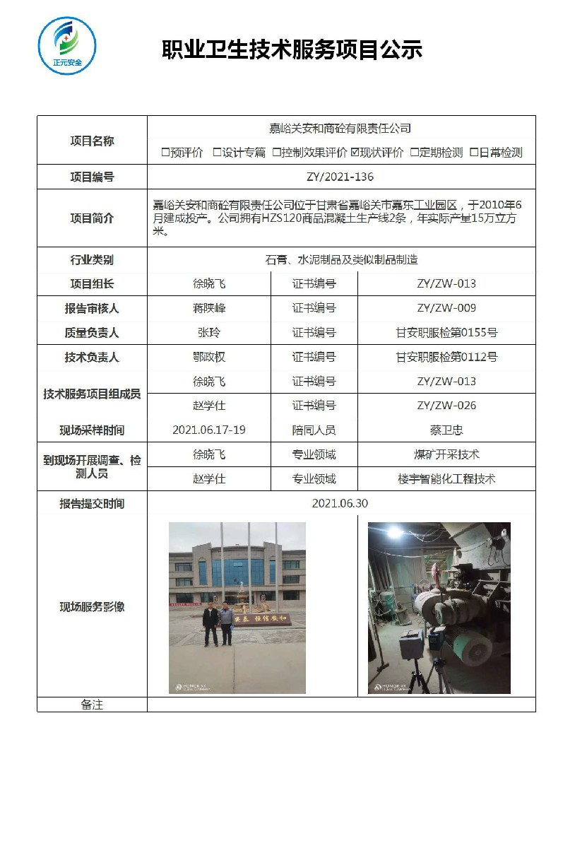 嘉峪关安和商砼有限责任公司职业病危害现状评价