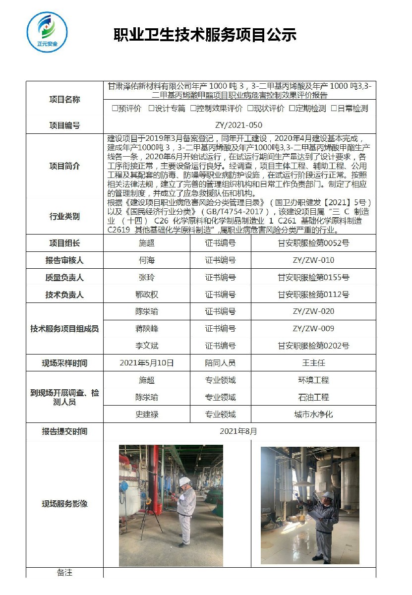甘肃泽佑新材料有限公司年产1000吨3.3-二甲基丙烯酸及年产1000吨3.3-二甲基丙烯酸甲酯项目职业病危害控制效果评价