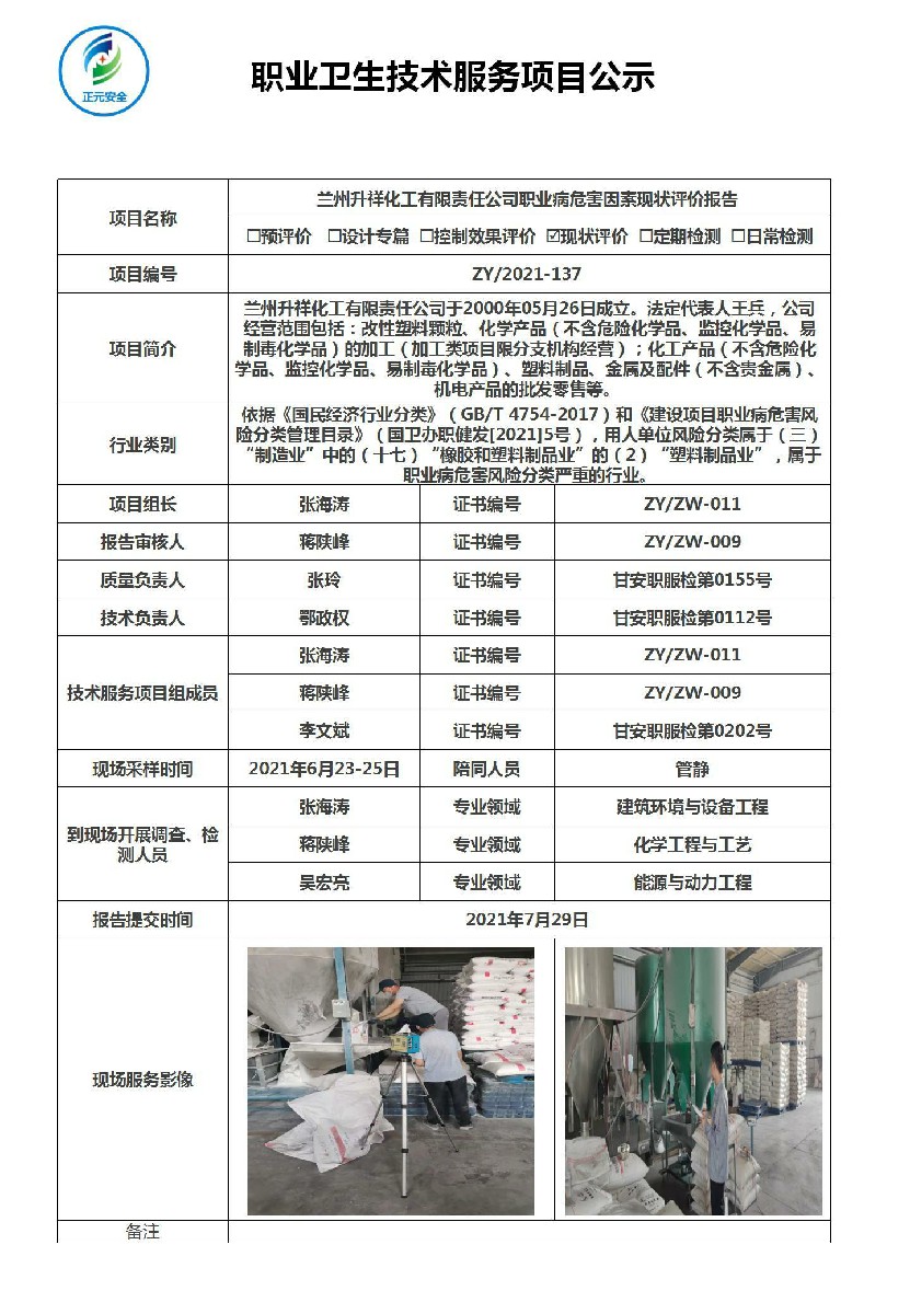 兰州升祥化工有限责任公司改性塑料颗粒生产线职业病危害现状评价