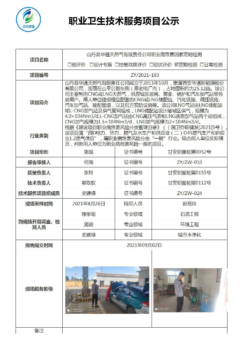 山丹县华通天然气有限责任公司职业病危害因素检测