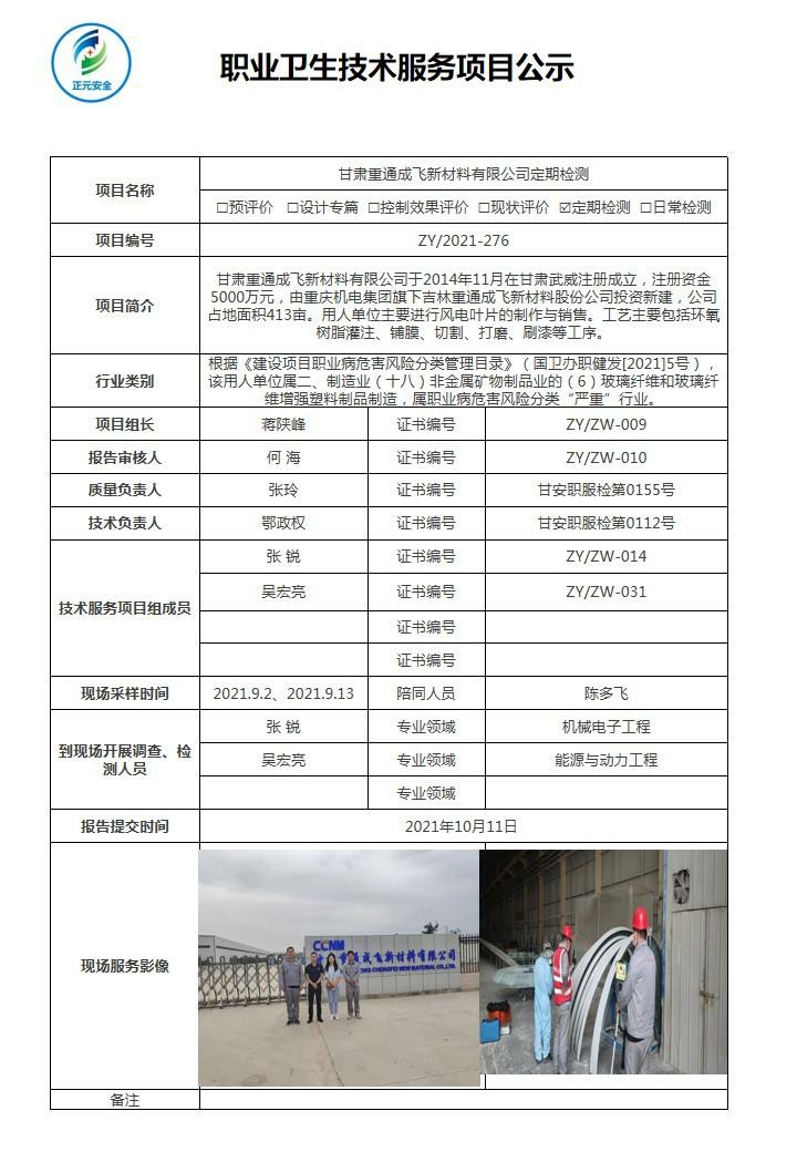 甘肃重通成飞新材料有限公司风电叶片生产线职业病危害因素检测