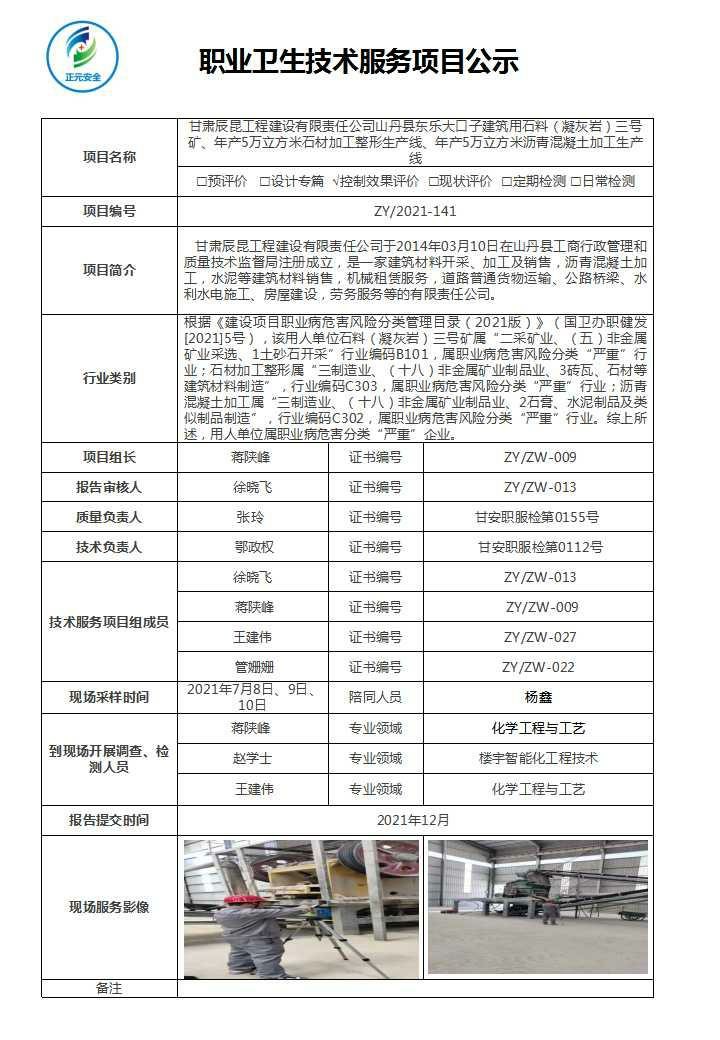 甘肃辰昆工程建设有限责任公司山丹县东乐大口子建筑用石料(凝灰岩)三号矿、年产5万立方米石材加工整形生产线、年产5万立方米沥青混凝土加工生产线职业病危害控制效果评价项目