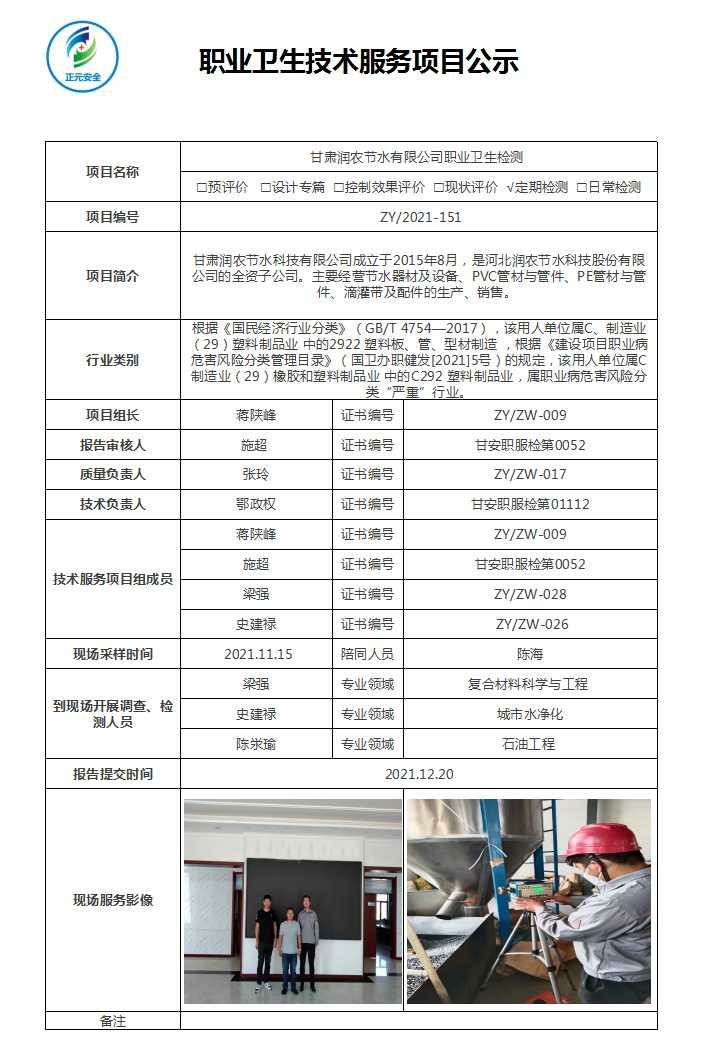 甘肃润农节水科技有限公司水管材生产线职业病危害因素检测