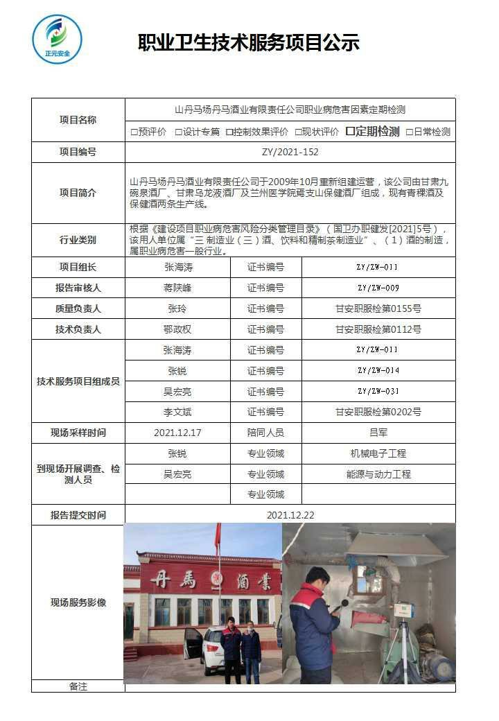 山丹马场丹马酒业有限责任公司职业病危害因素检测