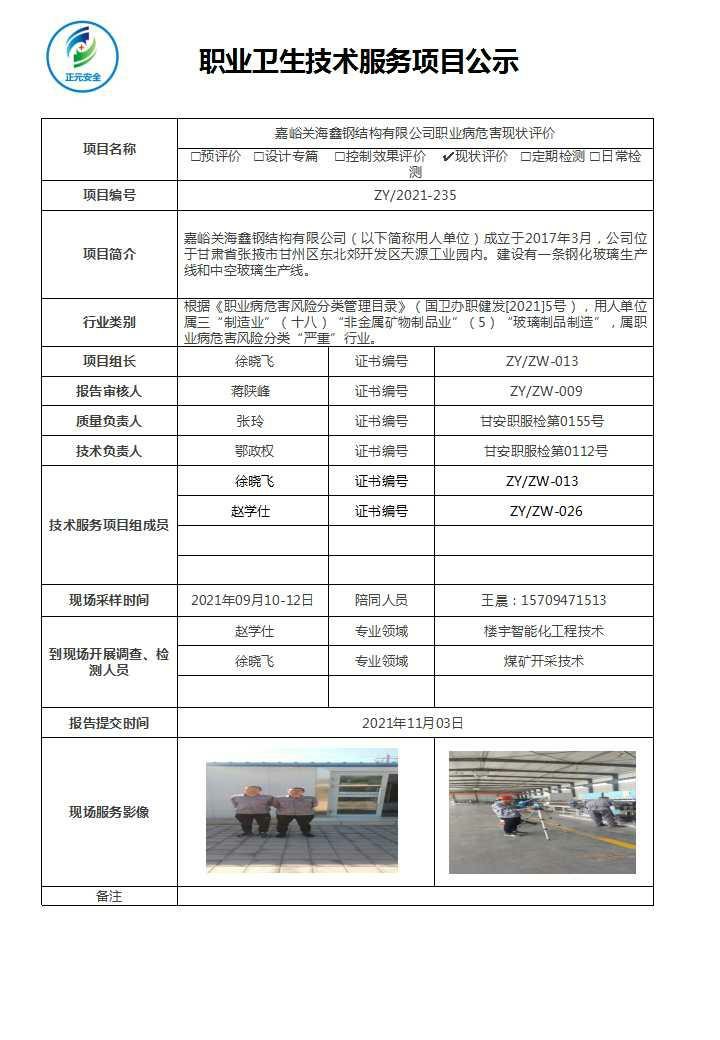 嘉峪关海鑫钢结构有限公司职业病危害现状评价