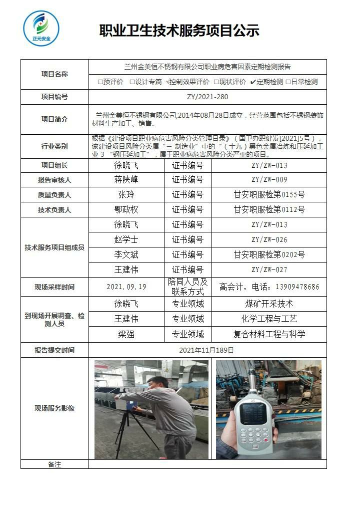 兰州金美恒不锈钢有限公司职业病危害因素检测