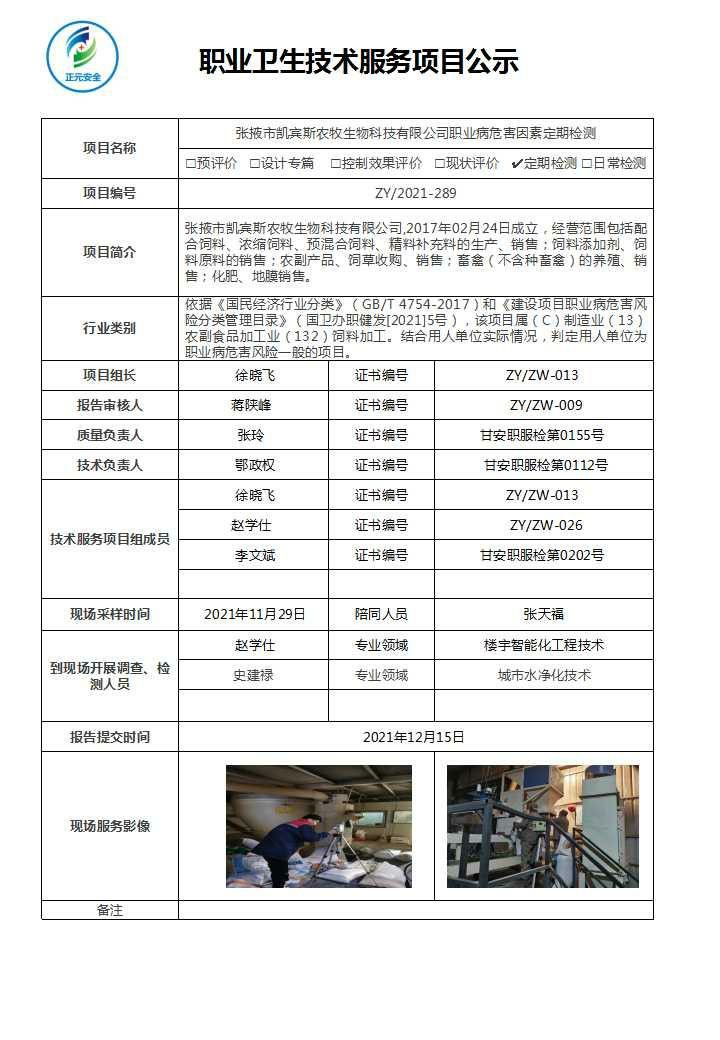 张掖市凯宾斯农牧生物科技有限公司职业病危害因素检测
