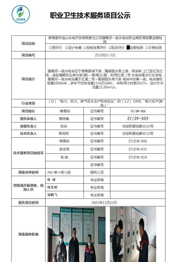 肃南县祁连山水电开发有限责任公司隆畅河一级水电站职业病危害因素检测