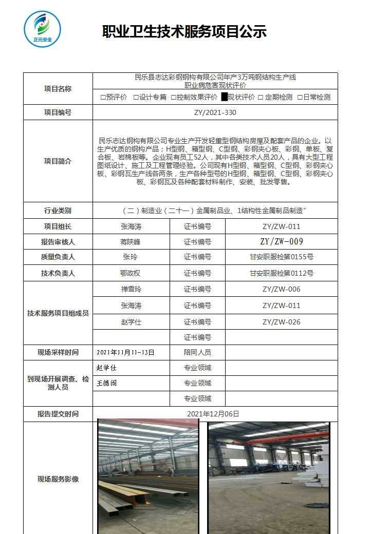 民乐县志达彩钢钢构有限公司年产3万吨钢结构生产线职业病危害现状评价