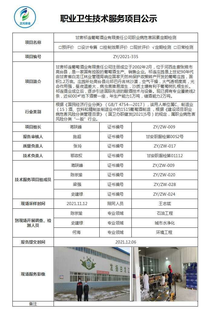 甘肃祁连山葡萄酒业有限责任公司职业病危害因素检测