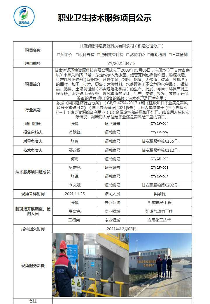 甘肃润源环境资源科技有限公司铝渣处理分厂2021年职业病危害因素定期检测