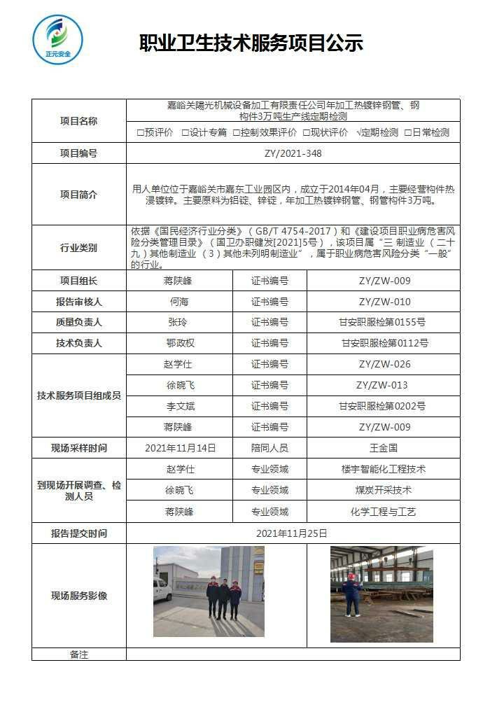 嘉峪关陽光机械设备加工有限责任公司职业病危害因素检测
