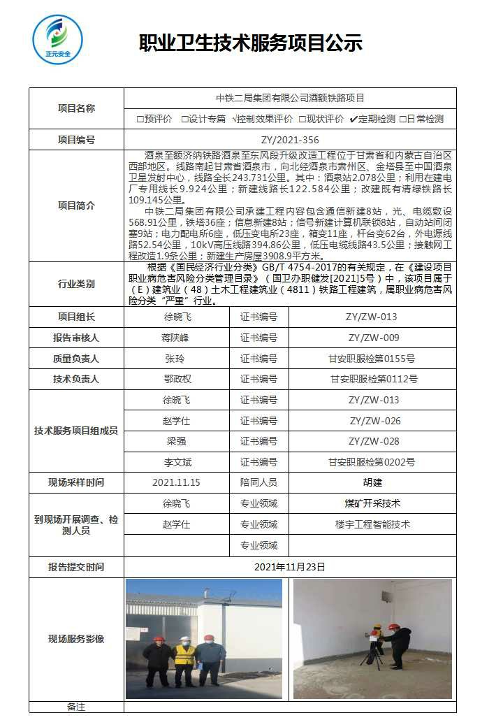 中铁二局集团有限公司酒额铁路项目职业病危害因素检测