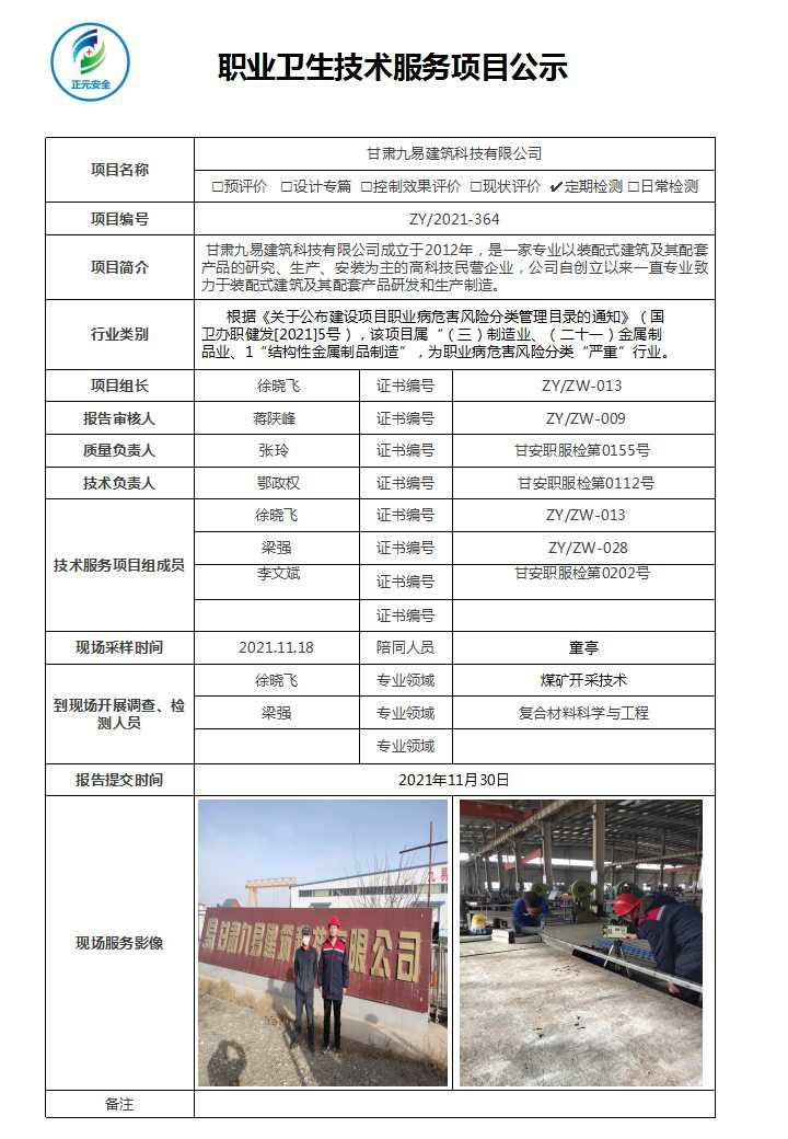 甘肃九易建筑科技有限公司职业病危害因素检测
