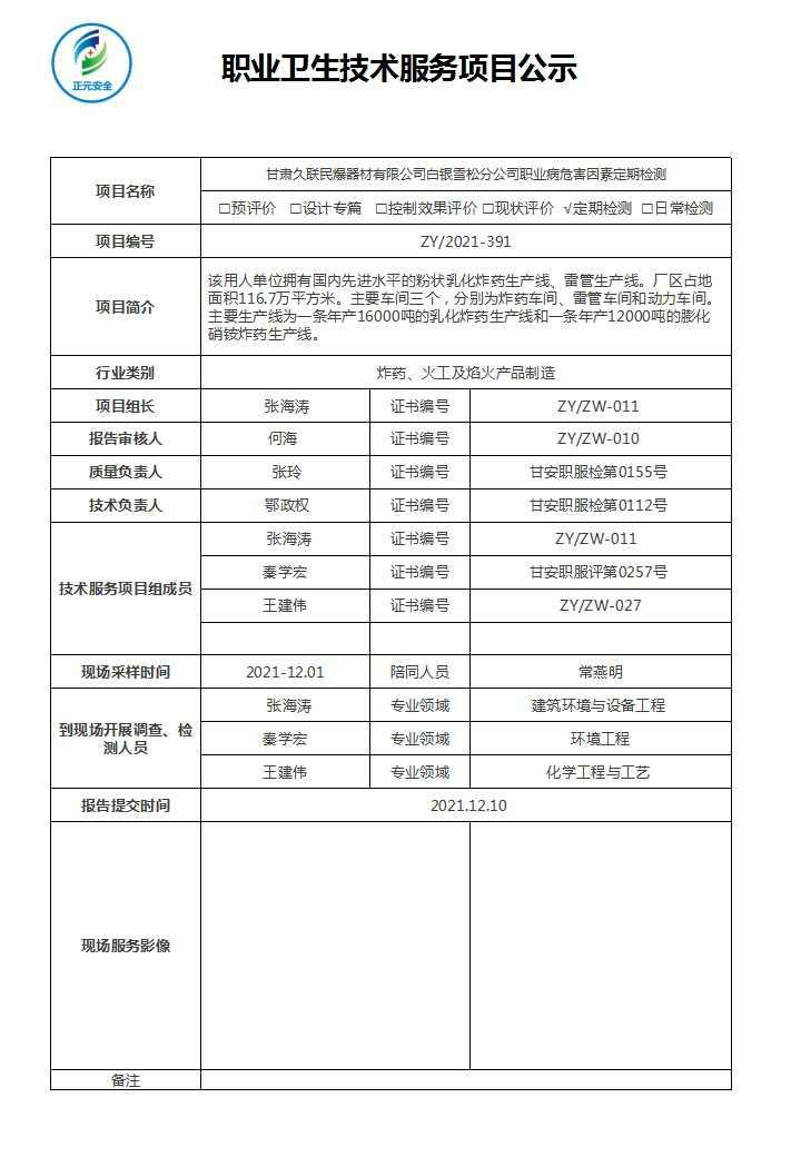 甘肃久联民爆器材有限公司白银雪松分公司职业病危害因素检测