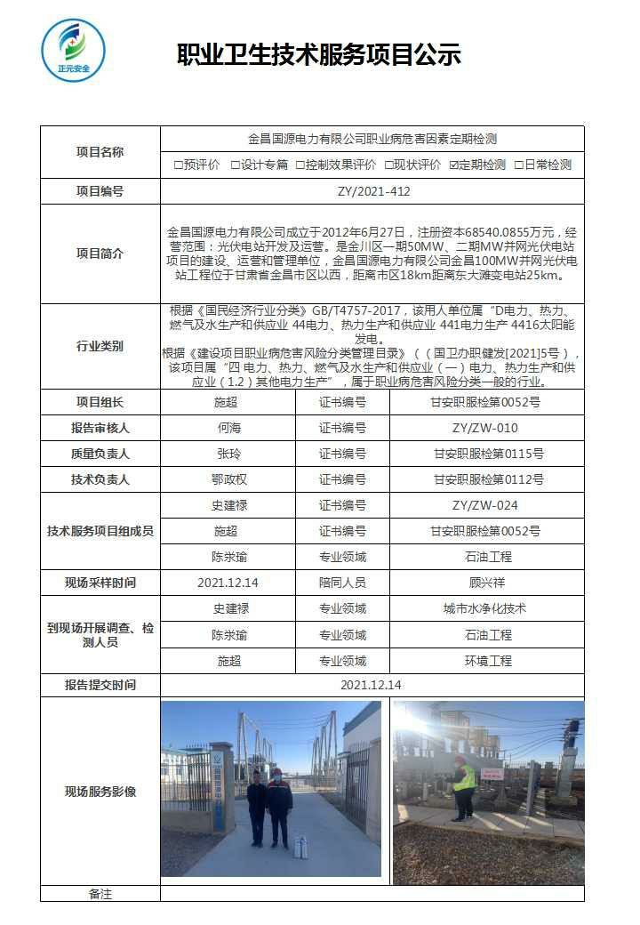 金昌国源电力有限公司职业病危害因素检测