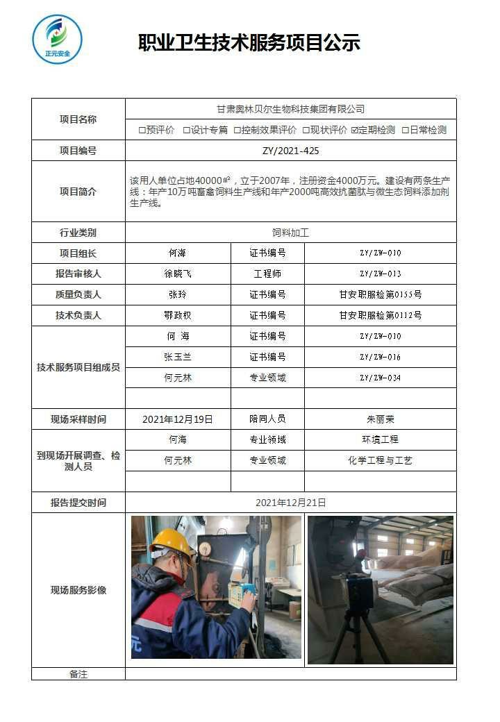 甘肃奥林贝尔生物科技集团有限公司年产10万吨畜禽饲料生产线职业病危害因素检测