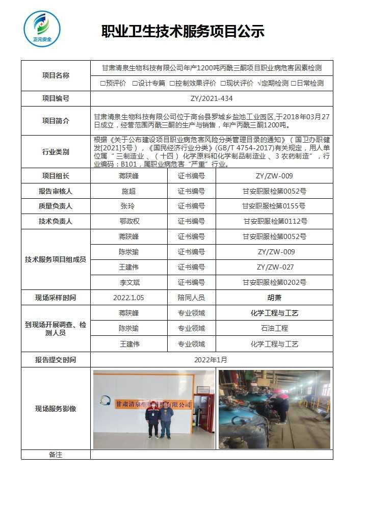 甘肃清泉生物科技有限公司年产1200吨丙酰三酮项目职业病危害因素检测