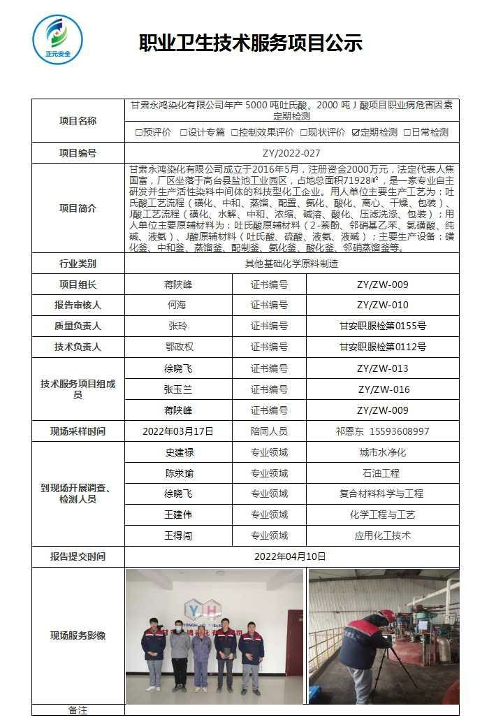 甘肃永鸿染化有限公司年产 5000 吨吐氏酸、2000 吨 J 酸项目职业病危害因素检测