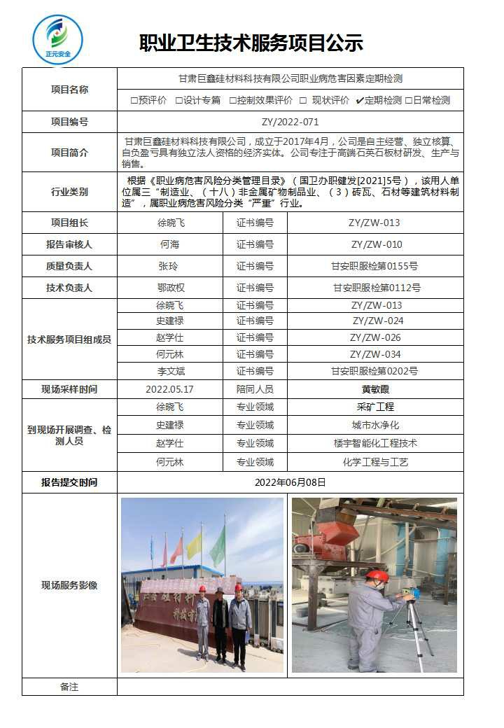 甘肃巨鑫硅材料科技有限公司年产150万平方米新型石英板材职业病危害因素定期检测