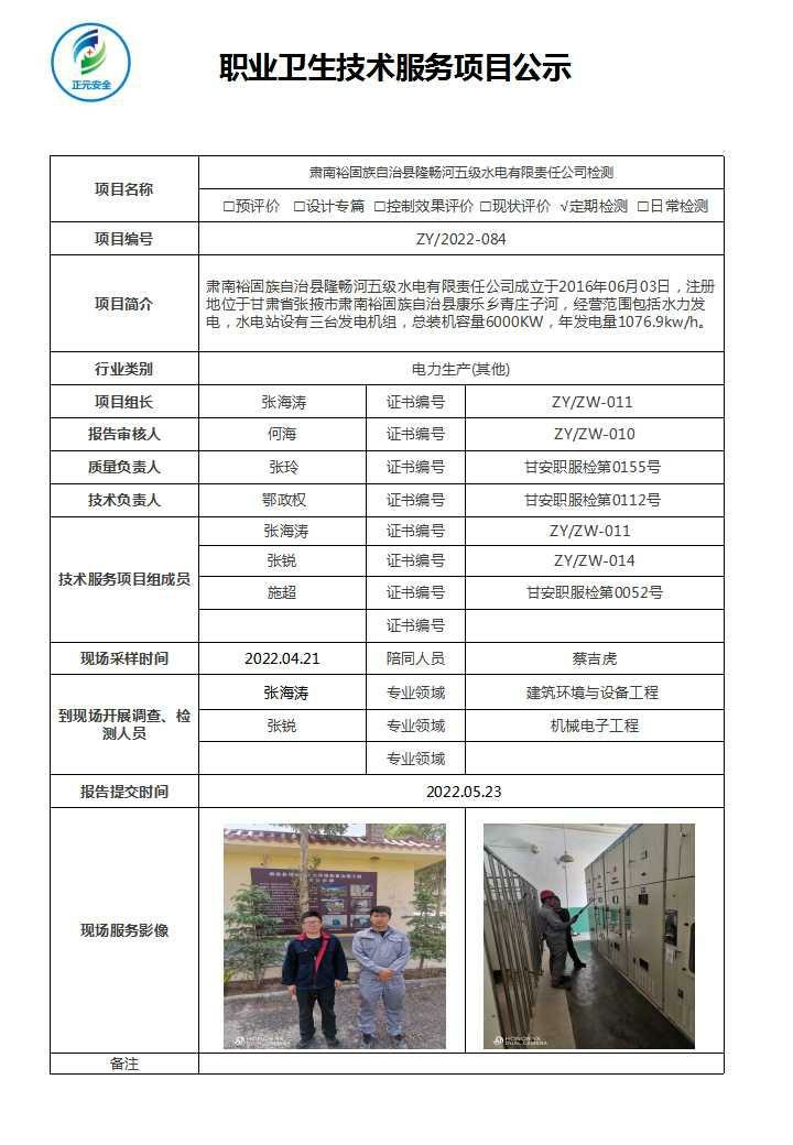 肃南裕固族自治县隆畅河五级水电有限责任公司职业病危害因素检测