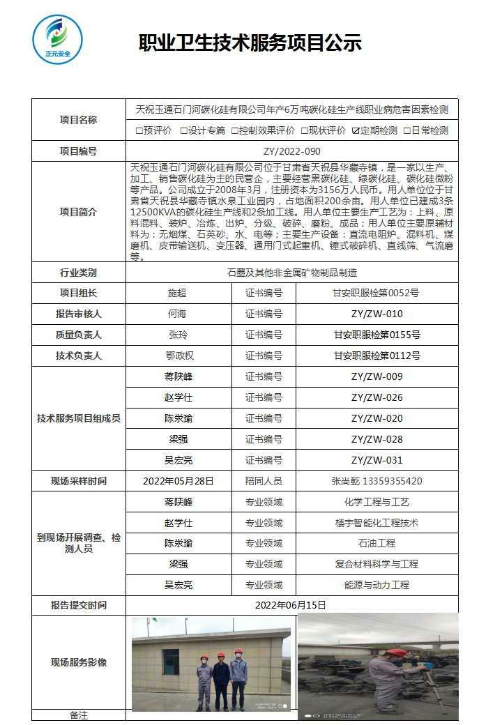 天祝玉通石门河碳化硅有限公司年产6万吨碳化硅生产线职业病危害因素检测