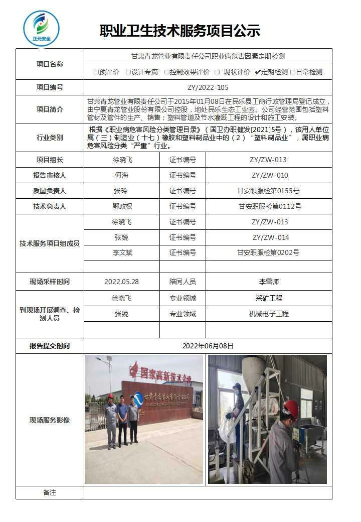 甘肃青龙管业有限责任公司职业病危害因素检测