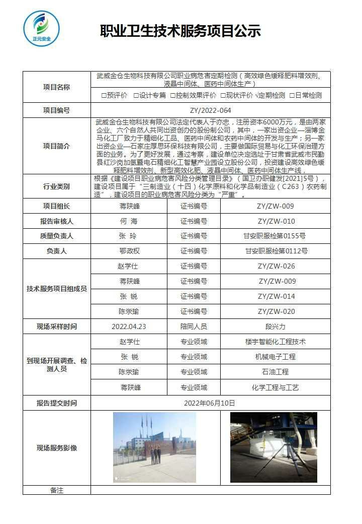 武威金仓生物科技有限公司高效绿色缓释肥料增效剂、液晶中间体、医药中间体生产(含罐区)项目职业病危害因素检测