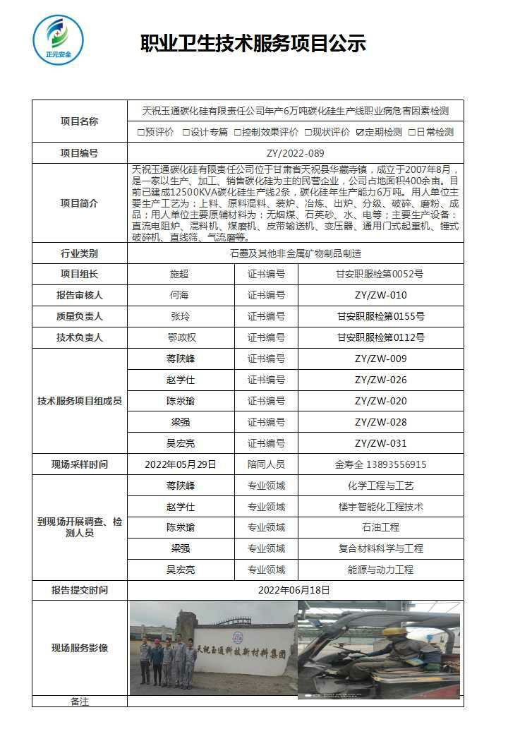 天祝玉通碳化硅有限公司年产6万吨碳化硅生产线职业病危害因素检测