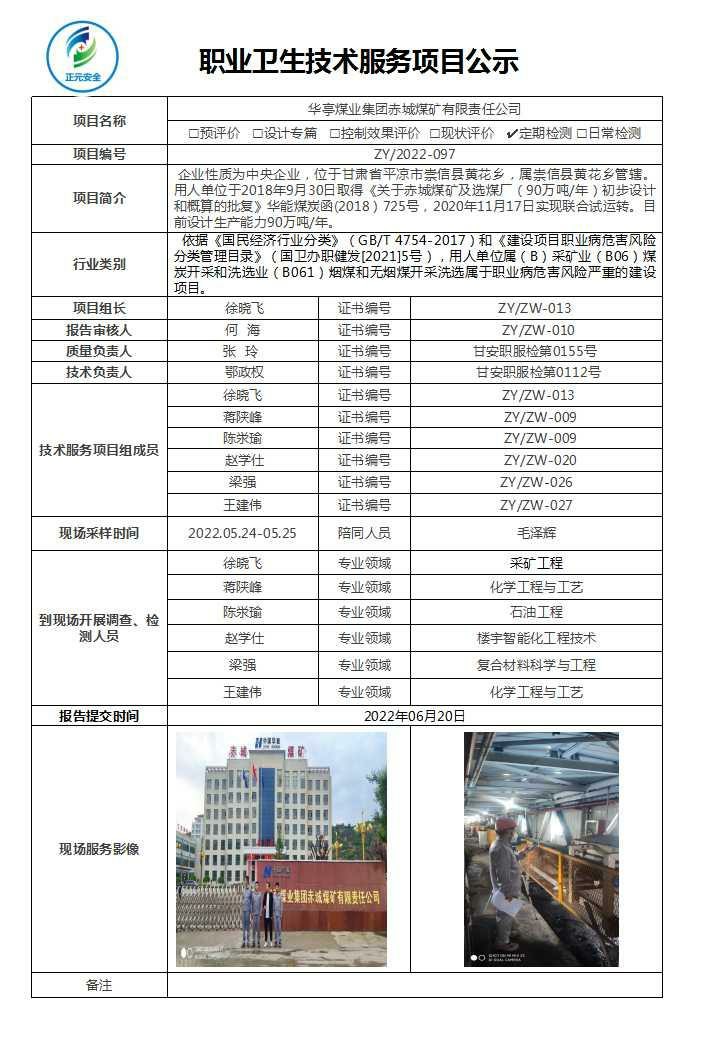 华亭煤业集团赤城煤矿有限责任公司职业病危害因素检测