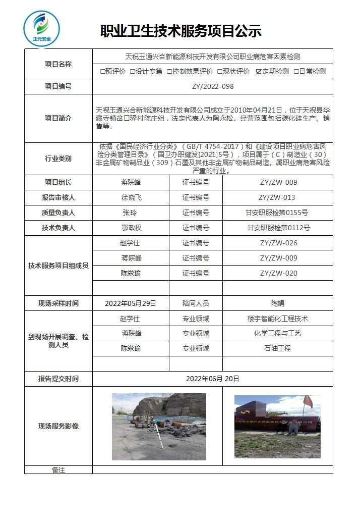 天祝玉通兴合新能源科技开发有限公司职业病危害因素检测
