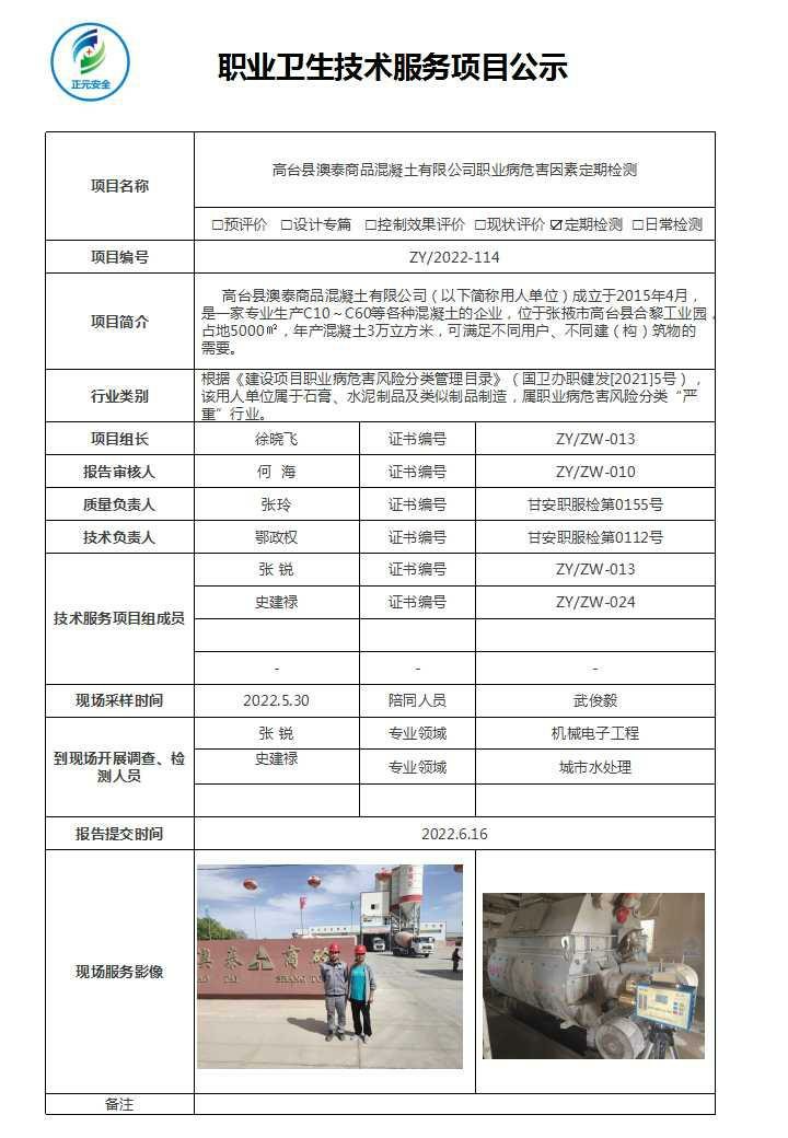 高台县澳泰商品混凝土有限公司职业病危害因素定期检测