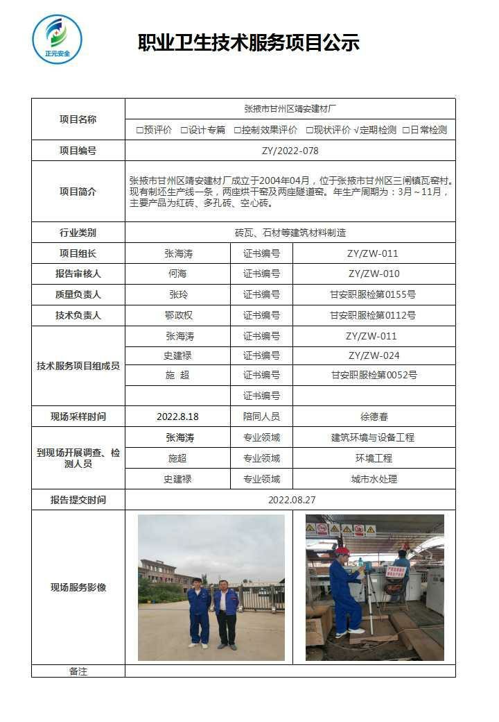 张掖市甘州区靖安建材厂职业病危害因素检测