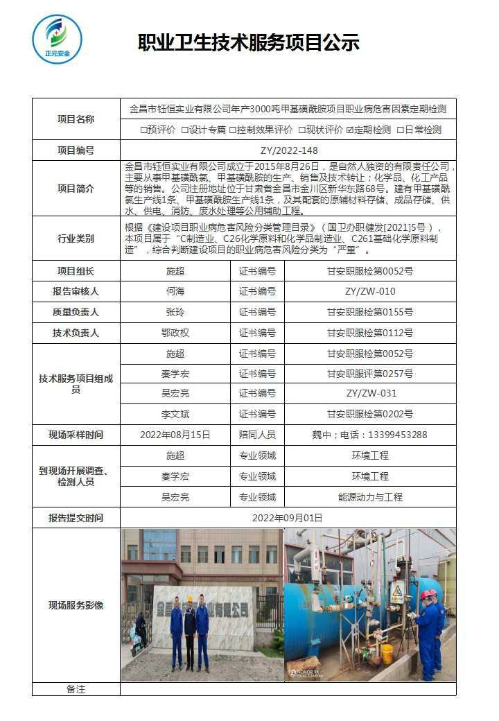 金昌市钰恒实业有限公司年产3000吨甲基磺酰胺项目职业病危害因素检测