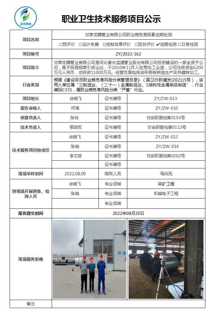 甘肃龙腾管业有限公司职业病危害因素检测