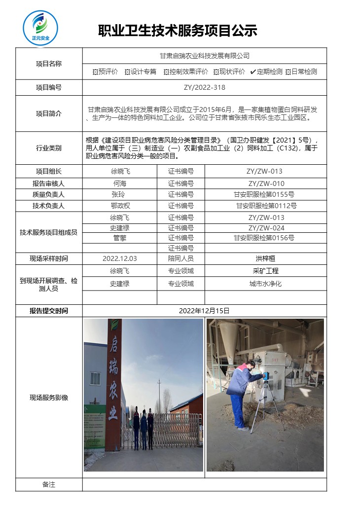 甘肃启瑞农业科技发展有限公司年产3万吨(颗粒)饲料和10万吨生物(青贮)饲料生产线职业病危害因素检测