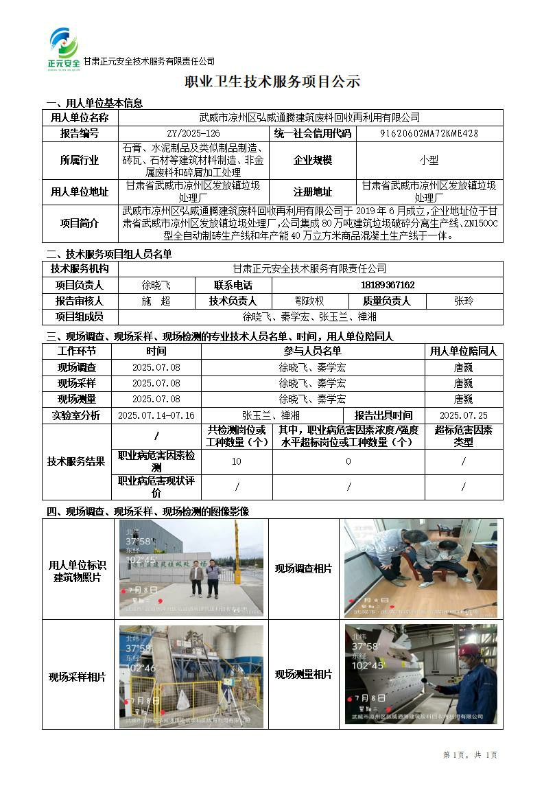 武威市凉州区弘威通腾建筑废料回收再利用有限公司职业病危害因素检测