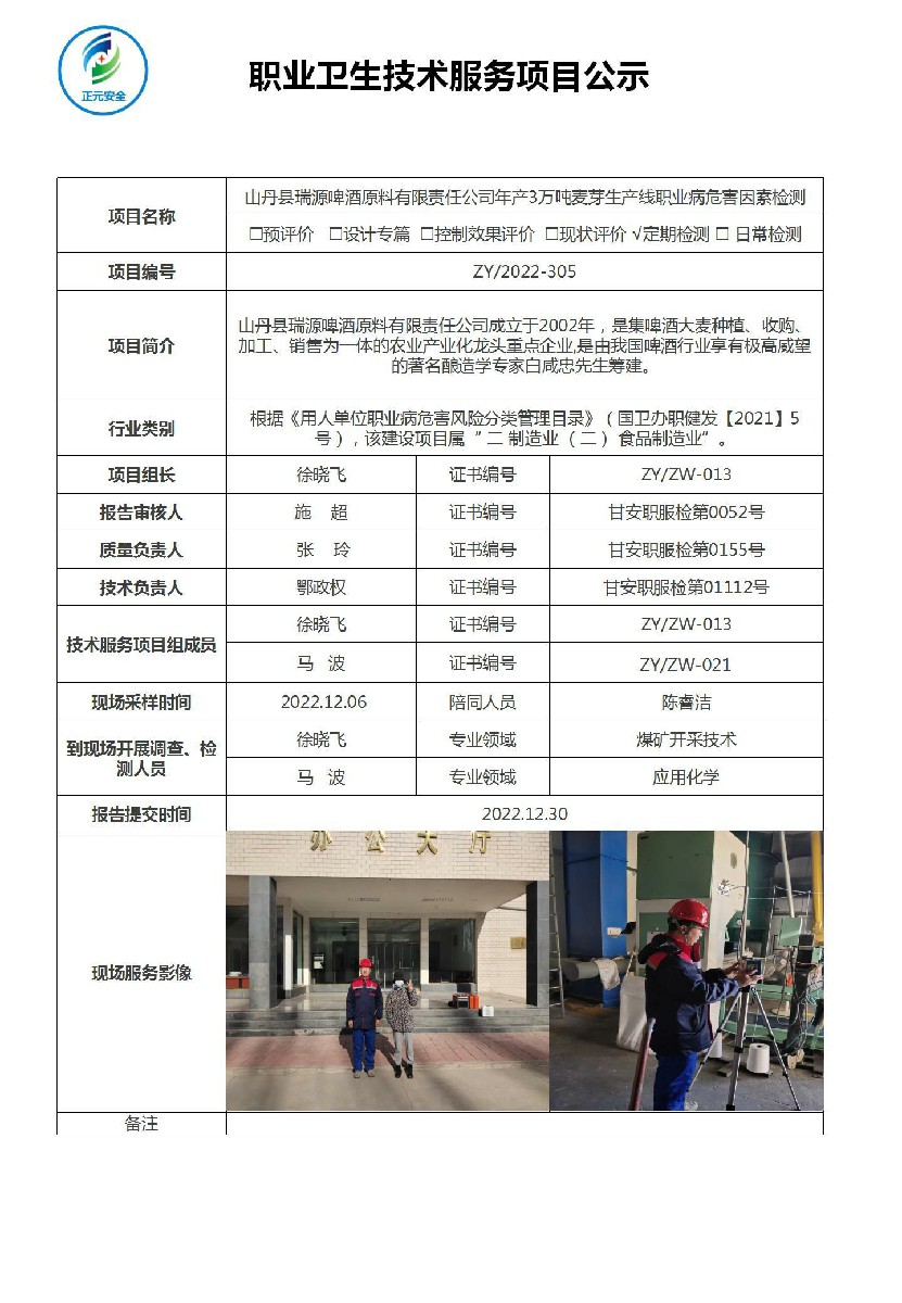 山丹县瑞源啤酒原料有限责任公司年生产3万吨麦芽生产线项目职业病危害因素定期检测