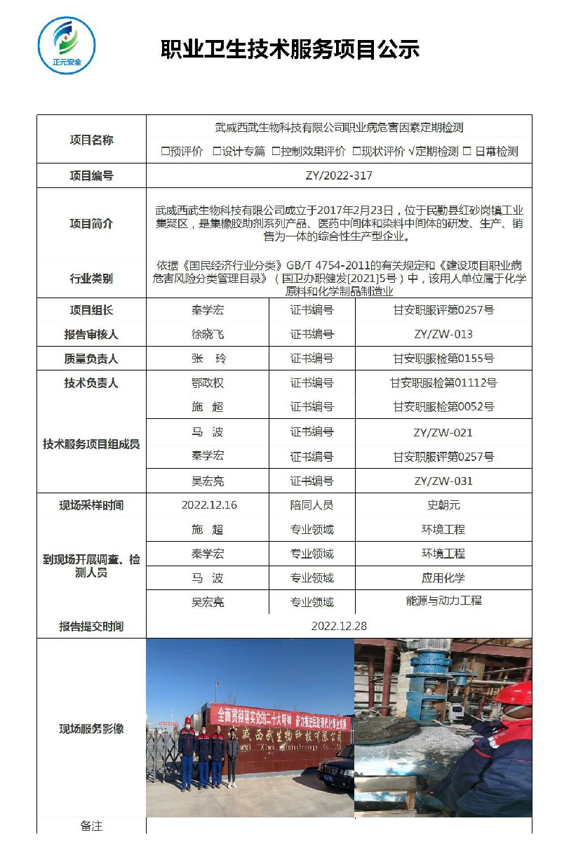 武威西武生物科技有限公司职业病危害因素检测