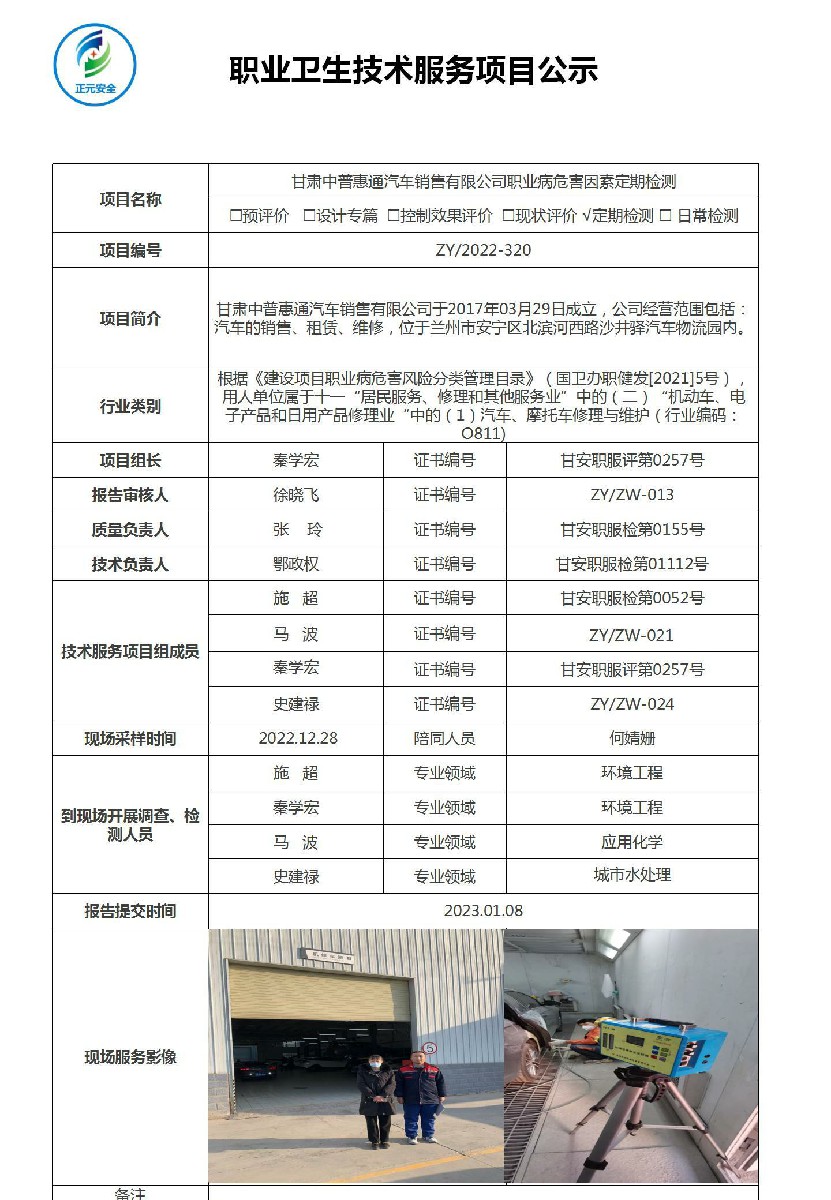 甘肃中普惠通汽车销售有限公司职业病危害因素检测