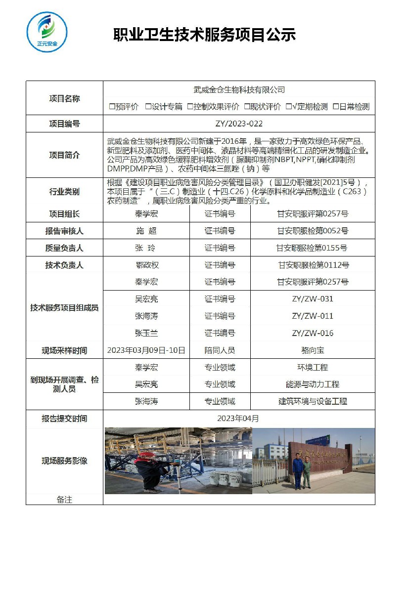 武威金仓生物科技有限公司NBPT(一车间)、DMPP、PP(二车间)、五千吨废物综合利用生产项目(七车间)、六车间生产线及机修车间、冷冻车间生产项目职业病危害因素定期检测