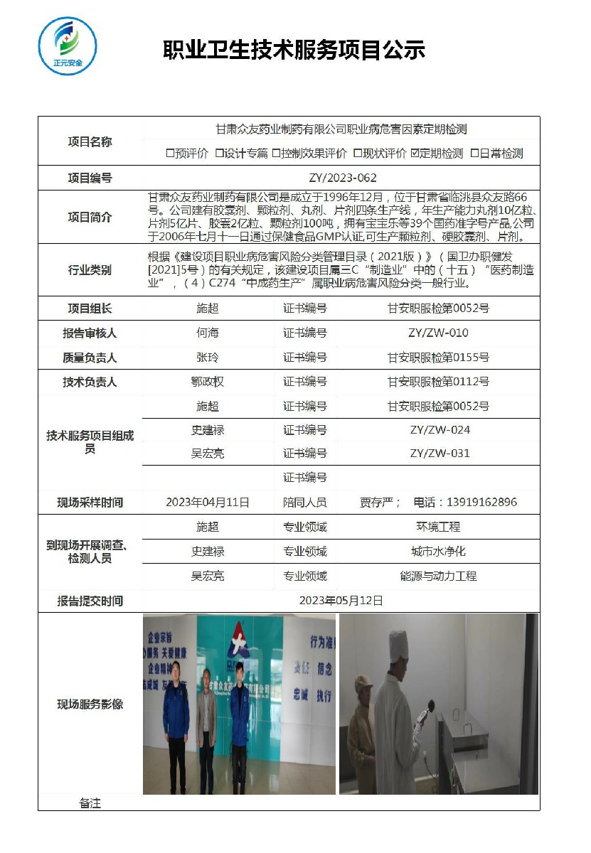 甘肃众友药业制药有限公司职业病危害因素检测
