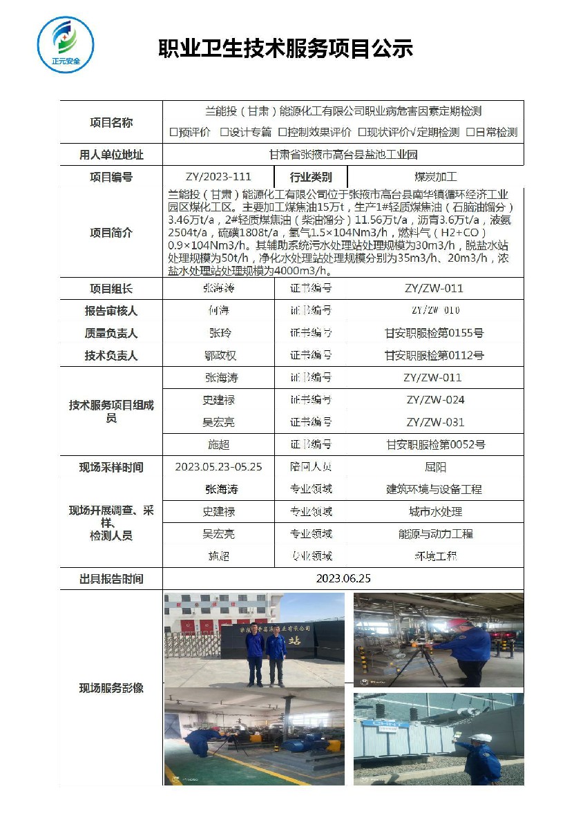 兰能投(甘肃)能源化工有限公司职业病危害因素定期检测