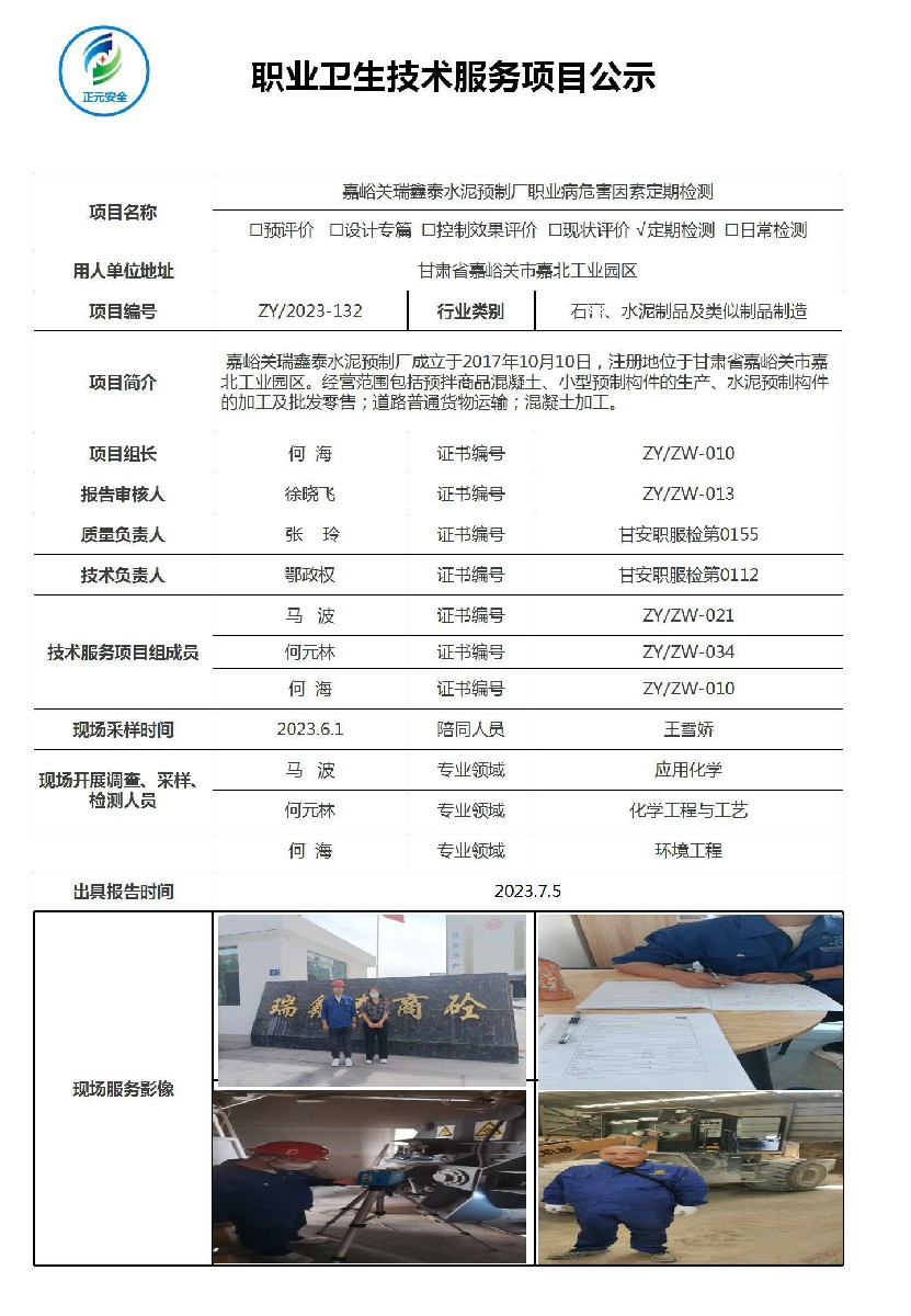 嘉峪关瑞鑫泰水泥预制厂职业病危害因素检测