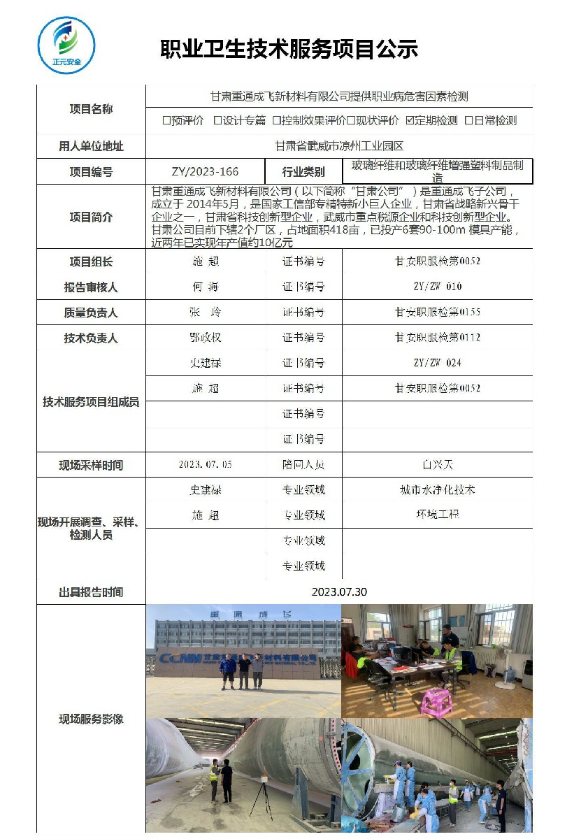 甘肃重通成飞新材料有限公司风电叶片生产线(二期)职业病危害因素检测