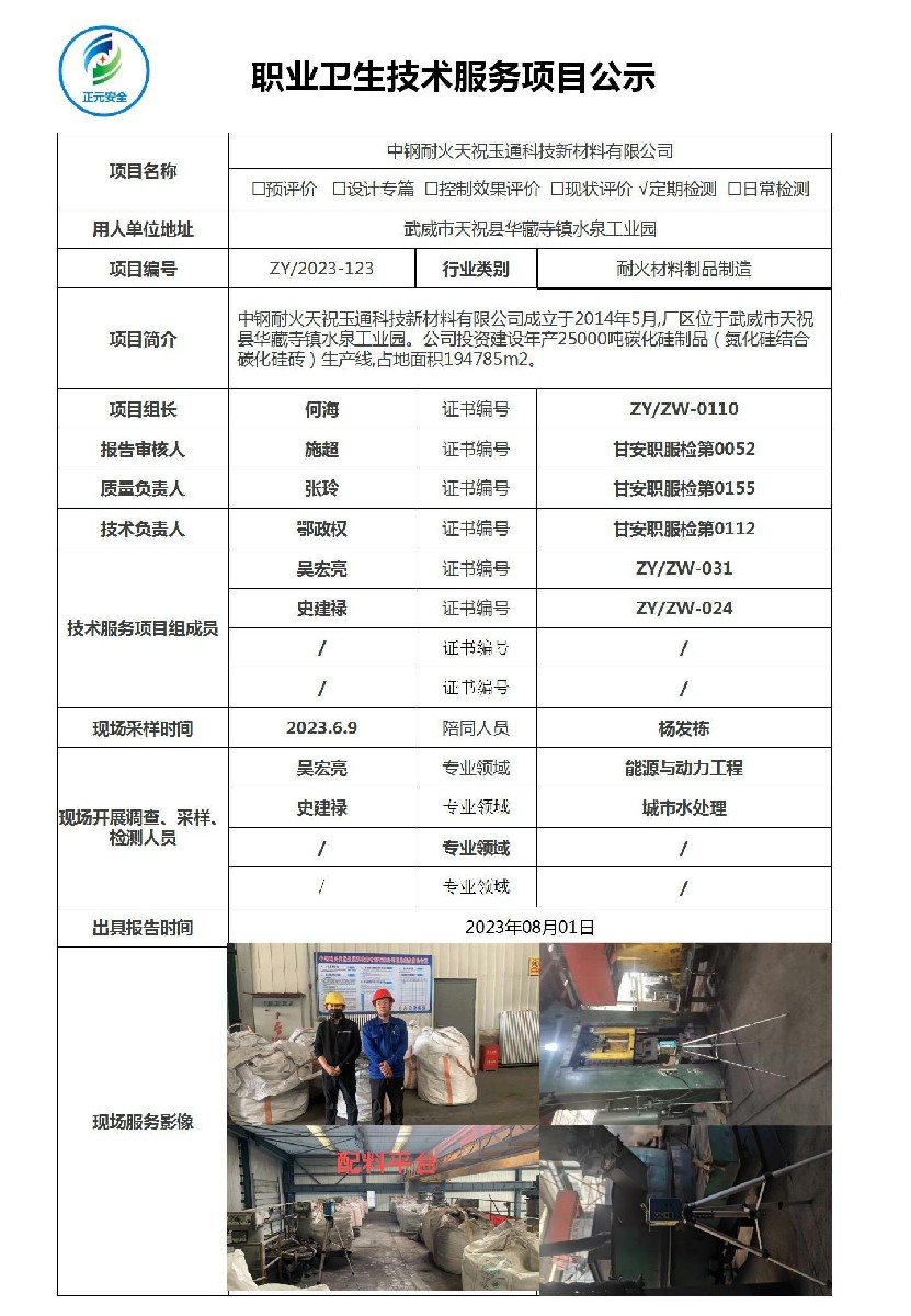 中钢耐火天祝玉通科技新材料有限公司职业病危害因素检测