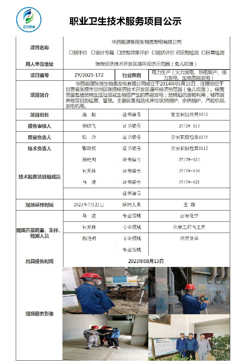 华西能源张掖生物质发电有限公司职业病危害因素检测